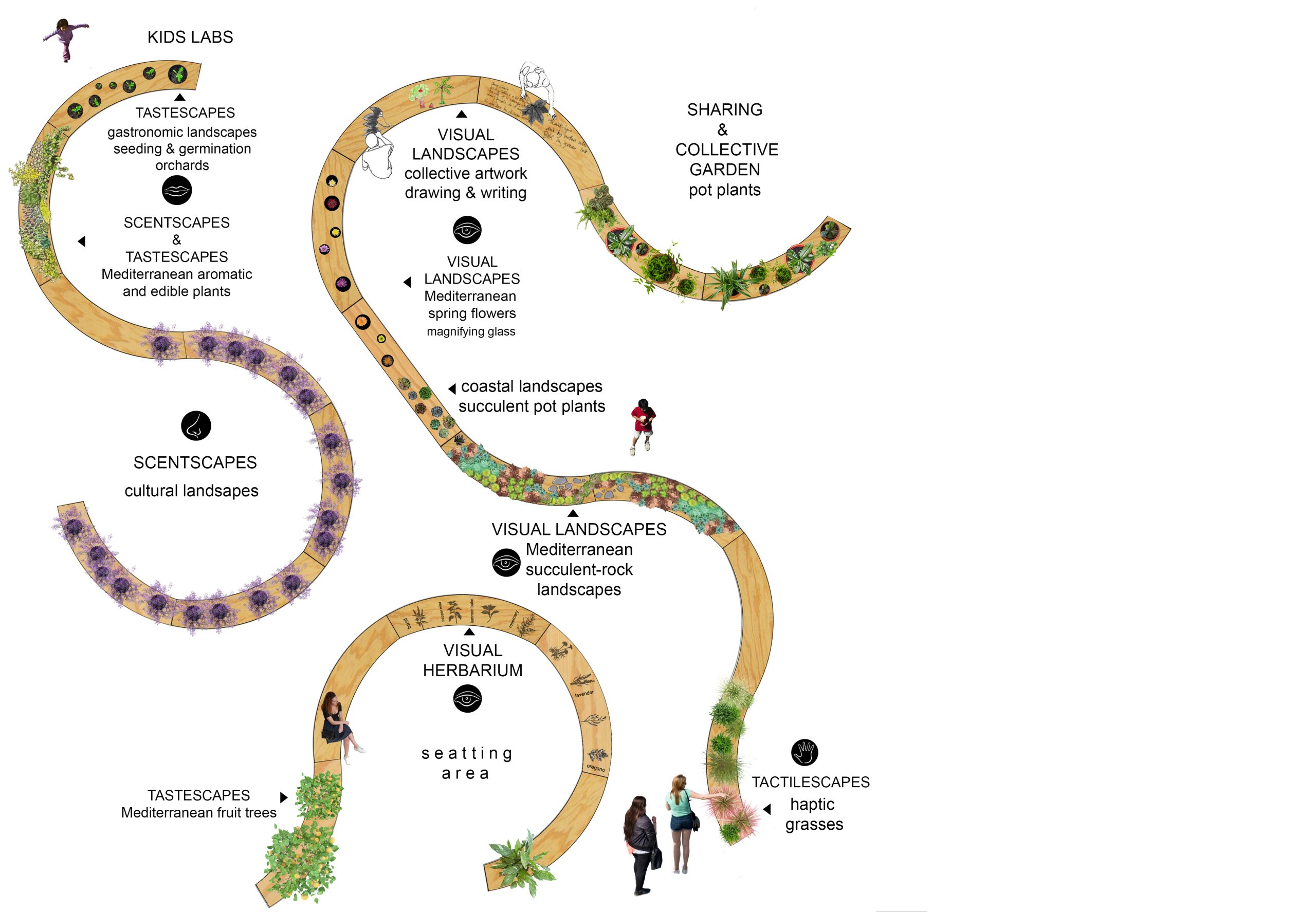 Along the garden, a continuous thread links visitors and sensory experiences. With this approach, Sensory Landscapes connects a series of scenarios with perceptions, creating a multi-layered garden across different tangible and intangible landscapes -scentscapes (aromatic plants), landscapes of taste (edible plants), hapticscapes (texture plants) and visual landscapes.