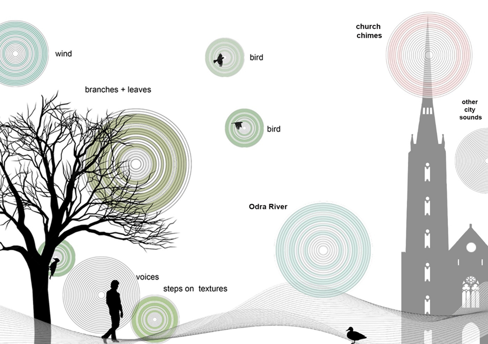 In the urban sections of Wrocław, soundscapes shift with the seasons. Spring and summer are marked by human activity—murmurs, laughter, footsteps, and vehicles—while autumn and winter reveal a quieter, more intimate auditory environment, where sounds are absorbed and the river’s voice becomes more perceptible.