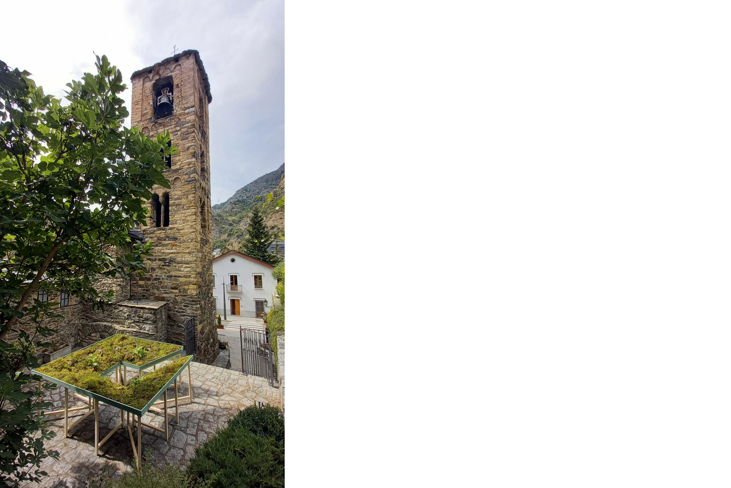 The site-installation is immersed in the heart of the medieval village of Sant Julià de Lòria, located on the slopes of the forest on the banks of the river. In this way, the piece Sottobosco is intimately displayed in a small square next to the bell tower of the 11th century church.