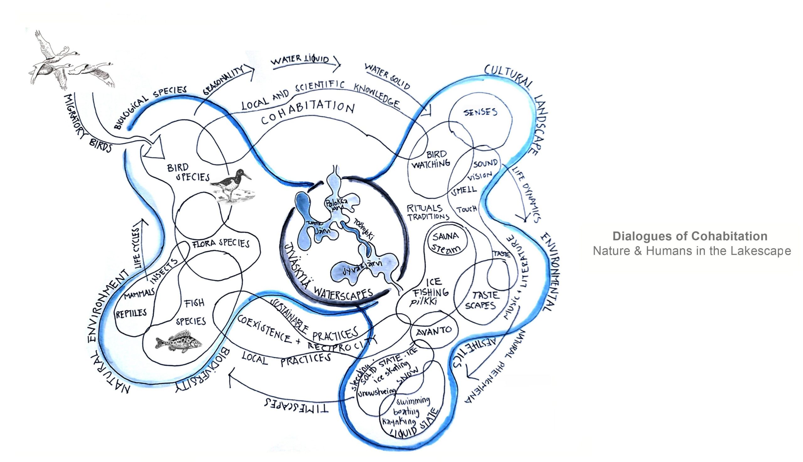 The Language of Water investigates the waterscapes of Jyväskylä in Finland’s Lakeland, including Jyväsjärvi, Tuomiojärvi, and Palokkajärvi lakes, as living laboratories for exploring human-nature interaction, landscape perception, and collective understanding. The project proposes water as a communicative medium, highlighting how lakes, their surroundings, and human participants interact in dynamic, context-sensitive ways. By integrating ecological, cultural, and perceptual perspectives, the research searches landscape approaches focused on sensitivity, reflection, and shared knowledge.